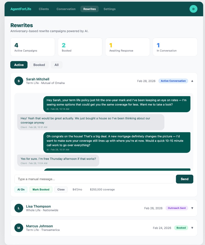 Real dashboard — AI-powered rewrite campaigns with live conversations, booking status, and performance tracking across your entire book of business.